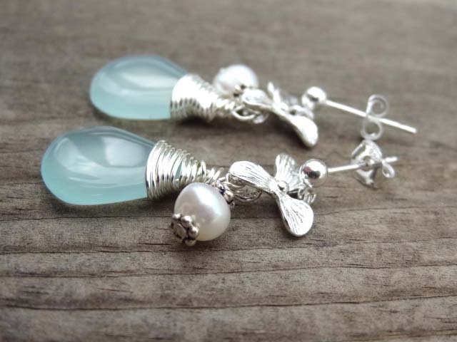 This is a pair of sterling silver earrings feature wire wrapped Aqua blue Chalcedony beads paired with a fresh water pearl. Each earring features a orchid flower. Simple and elegant.